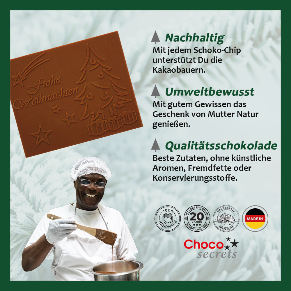 - Feinste belgische Vollmilchschokolade (6x5 cm, 20 g) mit weihnachtlichem Design.