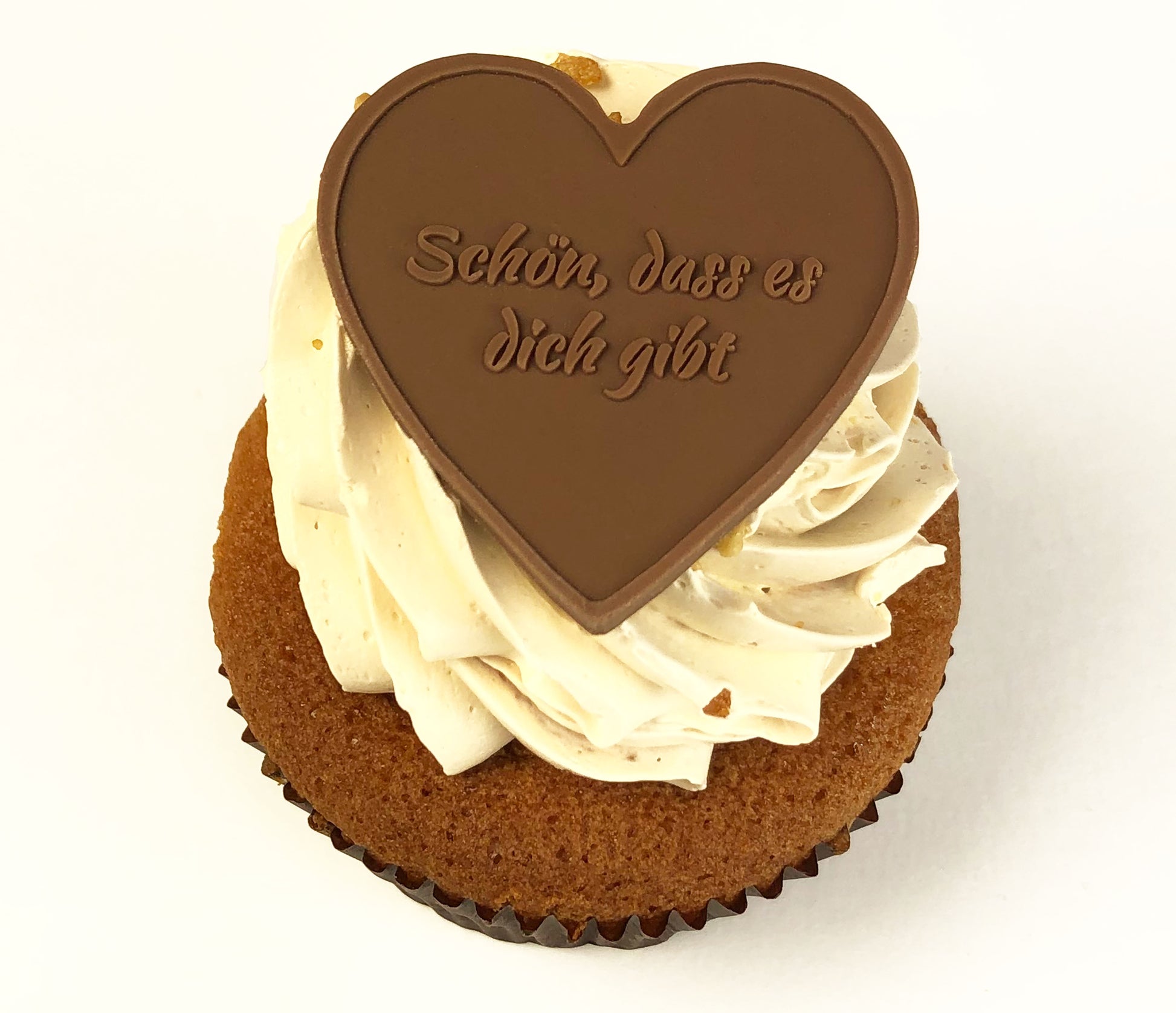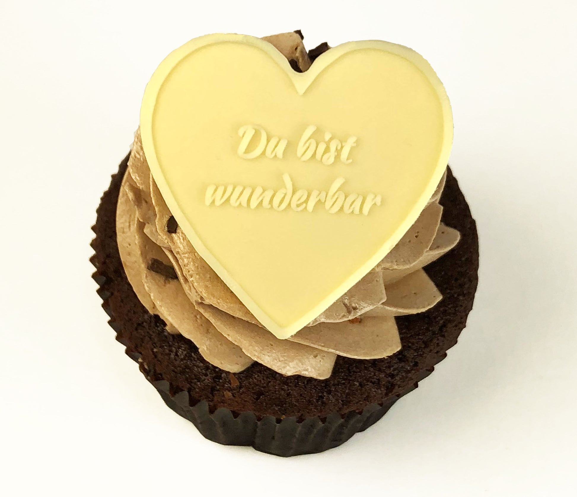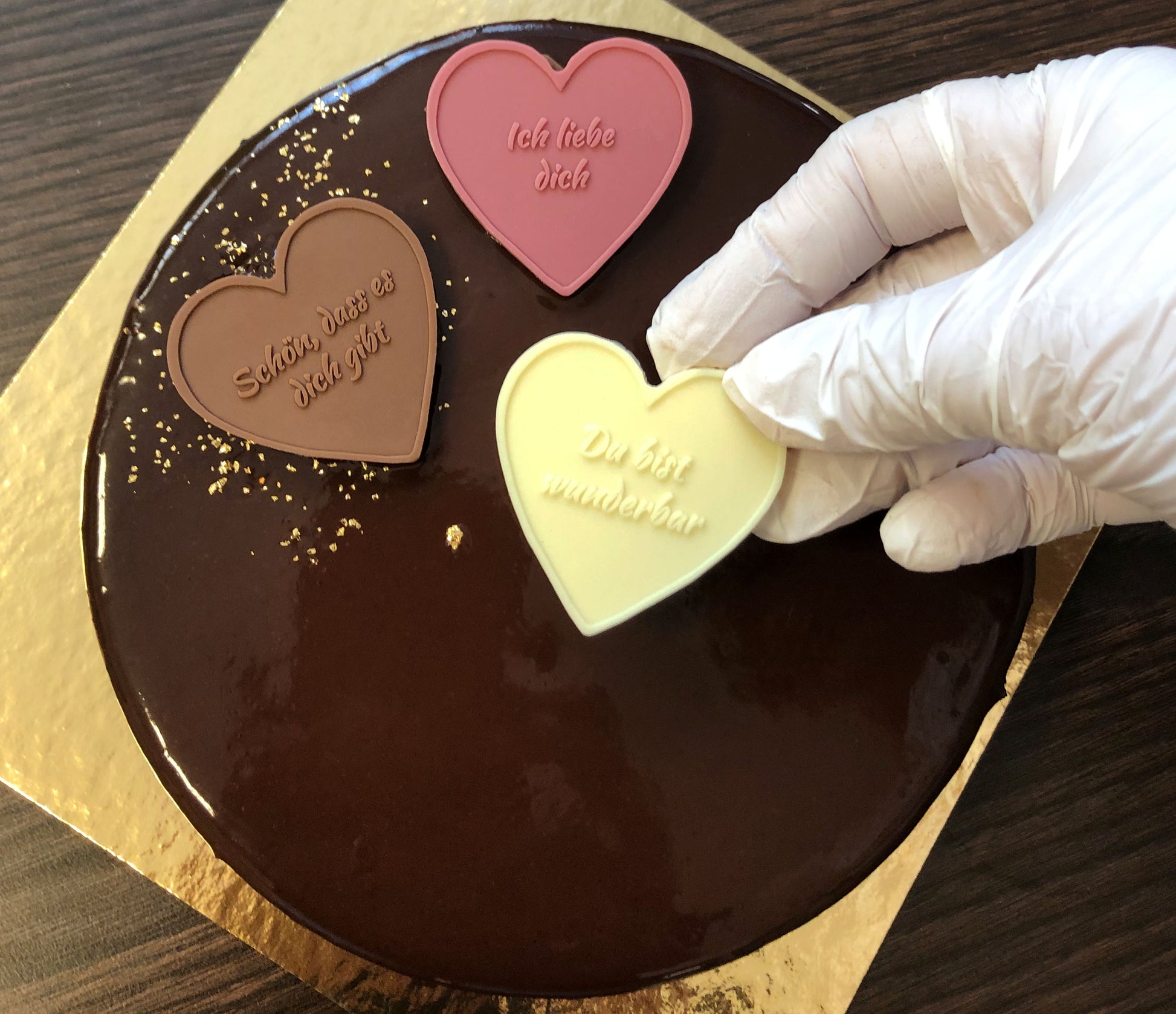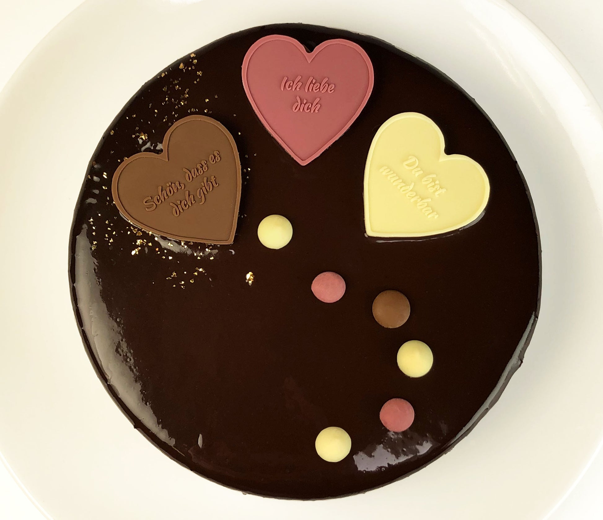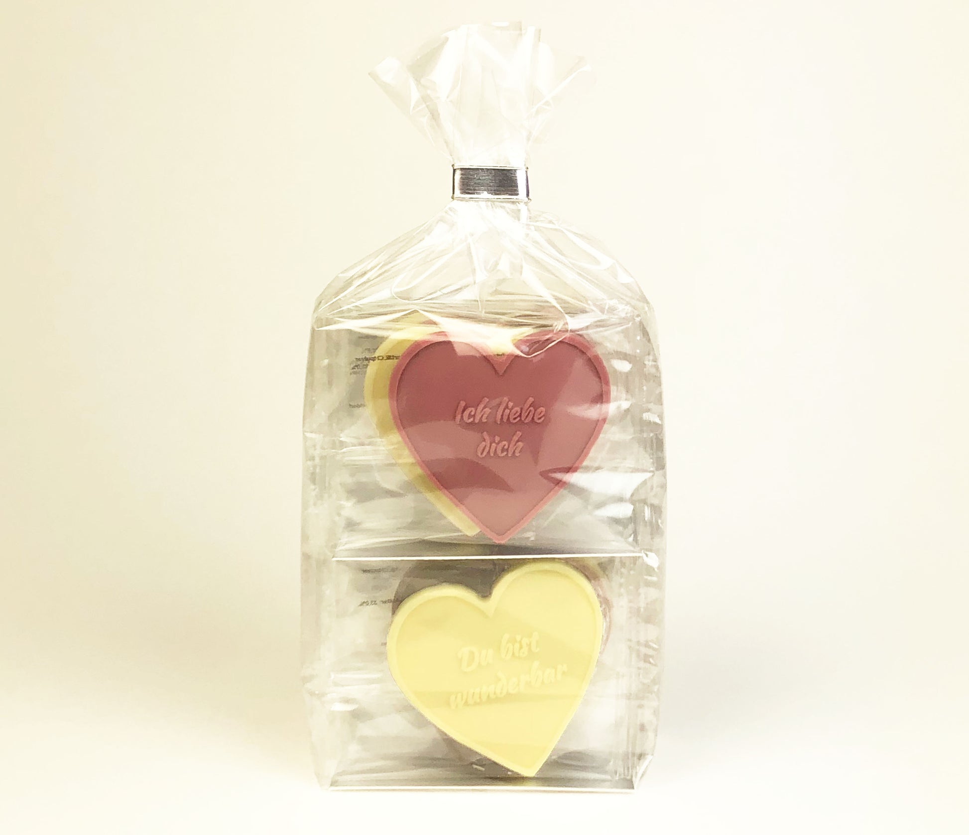 - Schoko-Herzen: 12 geprägte Schokoladenherzen á 5 cm. 4 x „Ich liebe dich“ in Ruby-Schokolade | 4 x „Du bist wunderbar“ in Vollmilch-Schokolade | 4 x „Schön, dass es dich gibt“ in weißer Schokolade