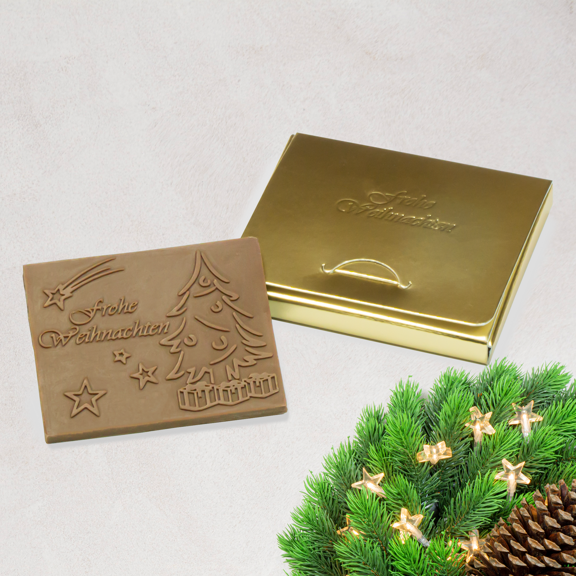 Chocolate envasado en caja de regalo dorada con el grabado "Feliz Navidad".