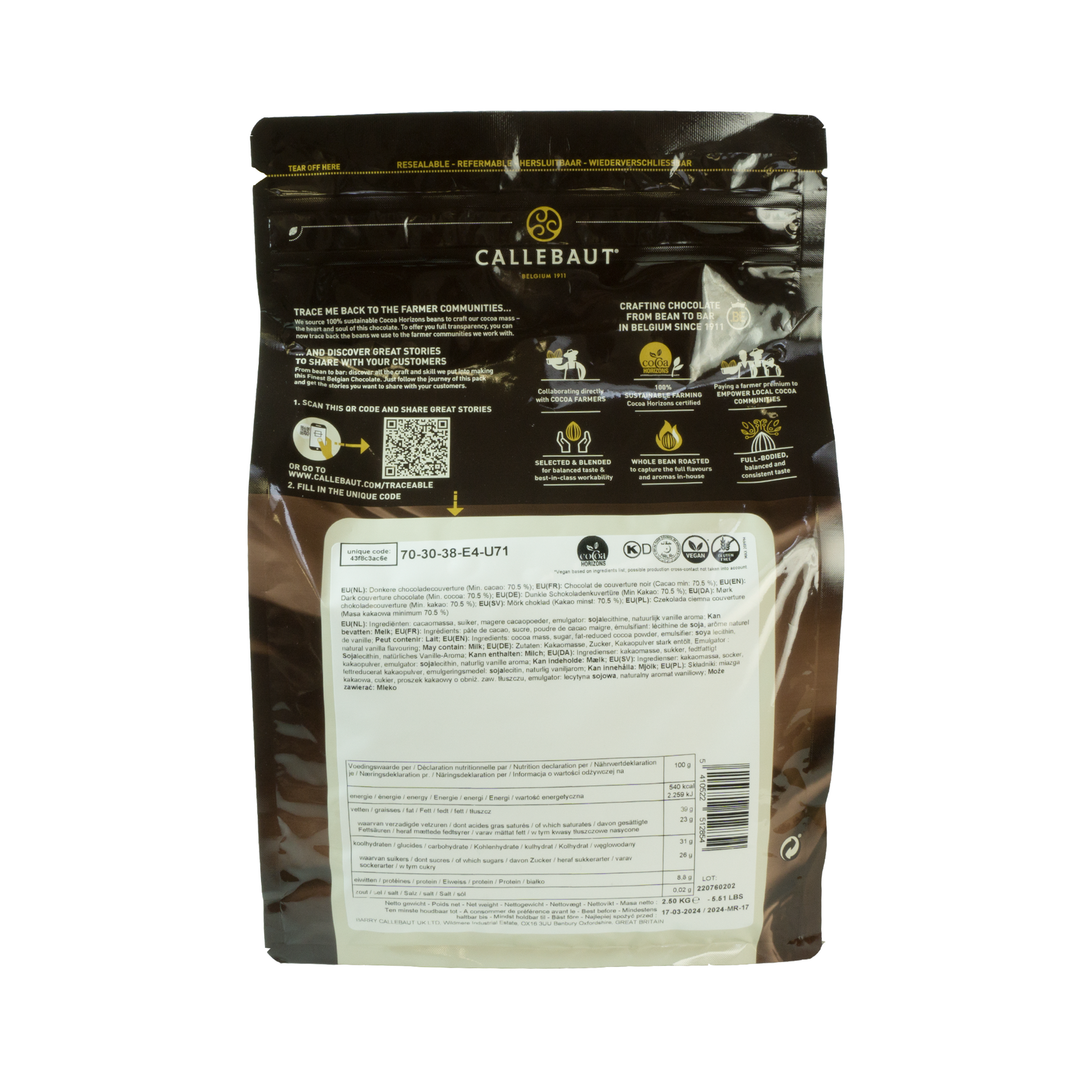• Callebaut dal 1911. Il miglior cioccolato belga (70,0% di cacao) a base di pregiate fave di cacao, Per ottenere un gusto perfettamente equilibrato e rotondo, mescoliamo fave di cacao provenienti da 3 diversi paesi di origine: Costa d'Avorio, Ghana ed Ecuador.