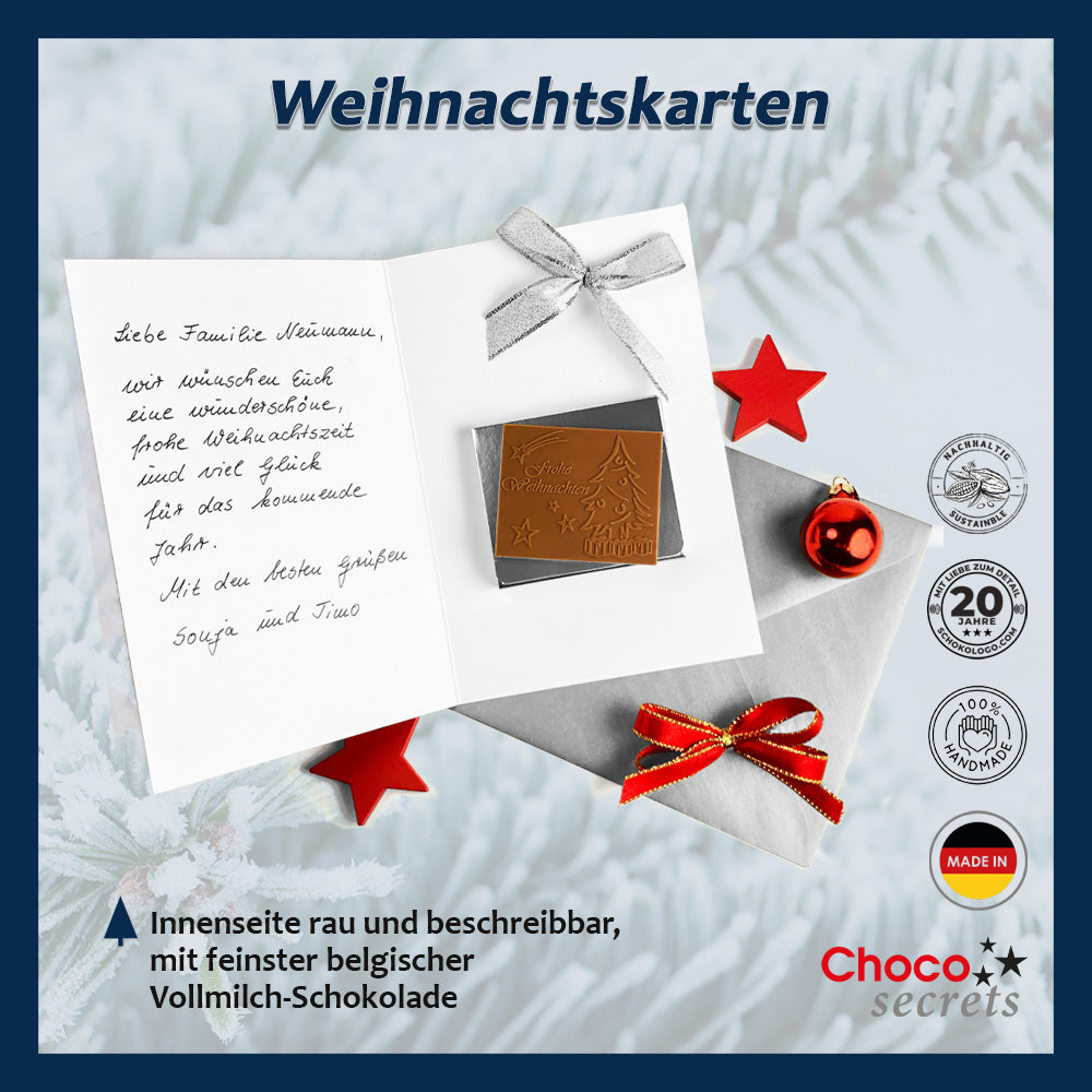Christmas cards with embossed chocolate in a silver box, set of 5, card design: dark blue sky with Christmas tree, embossed chocolate: "Frohe Weihnachten", envelope in silver